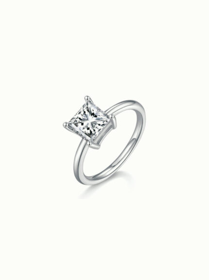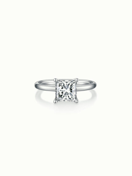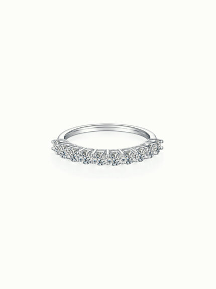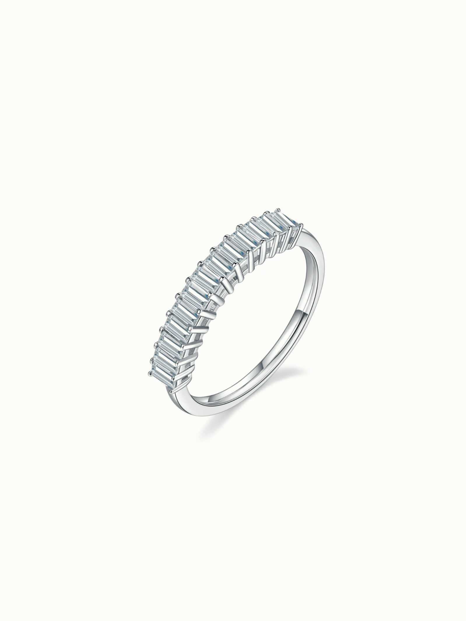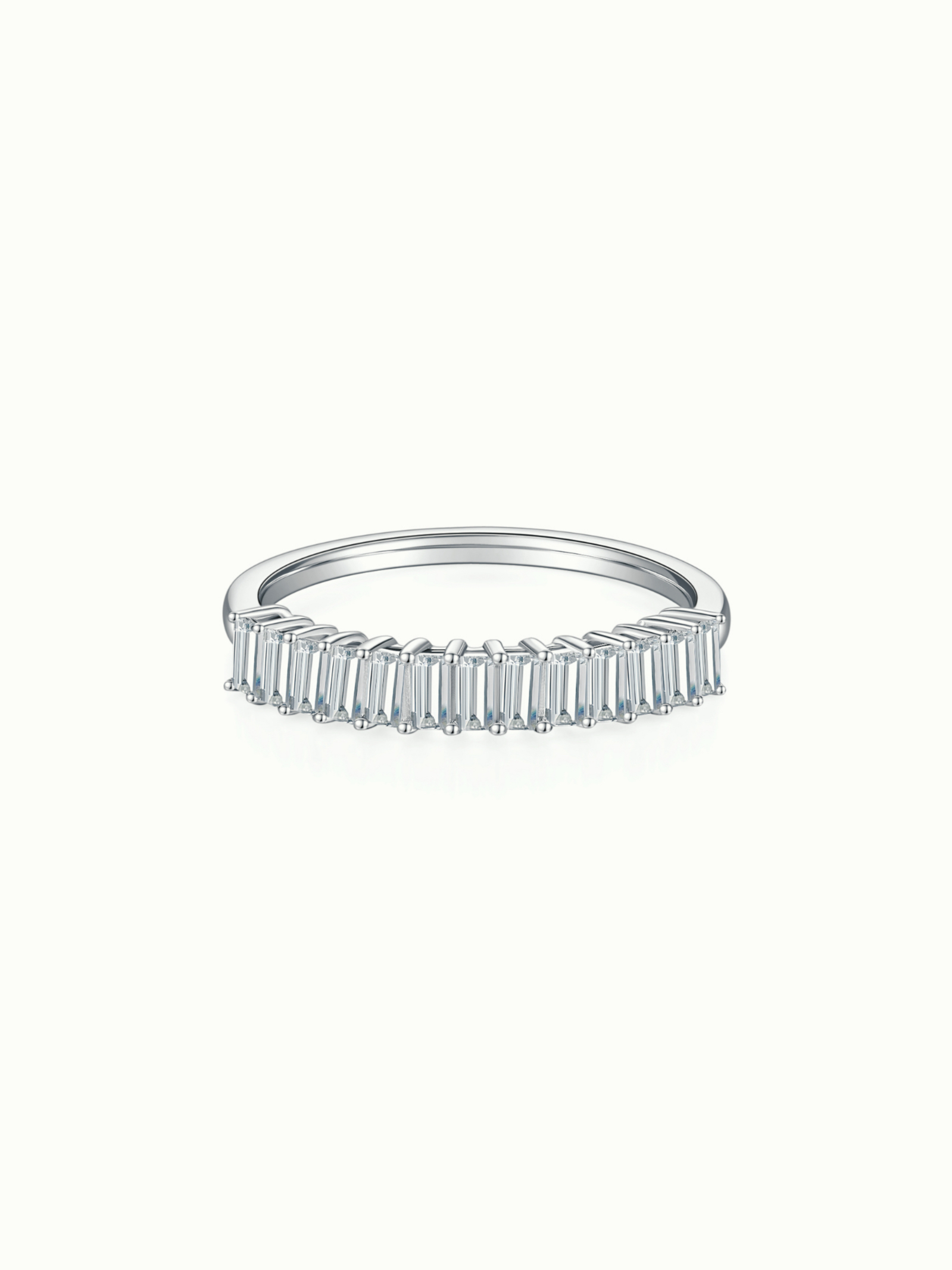 The emerald-cut moissanite reveals strength and refinement through its elongated geometry. With world-selected moissanite hand-set in White Gold Vermeil, the half-eternity ring sits comfortably on the finger, perfect for solo or layered wear.