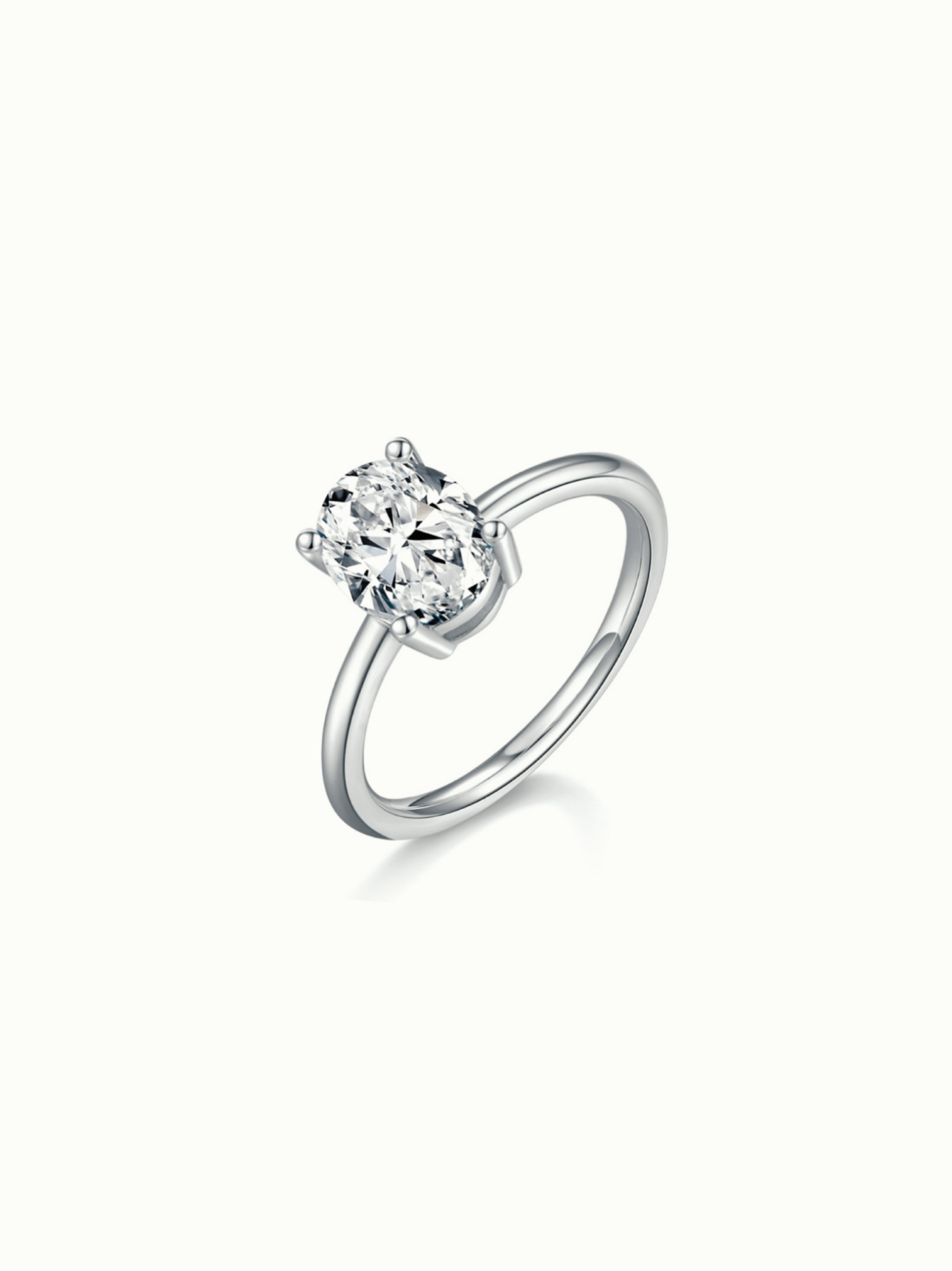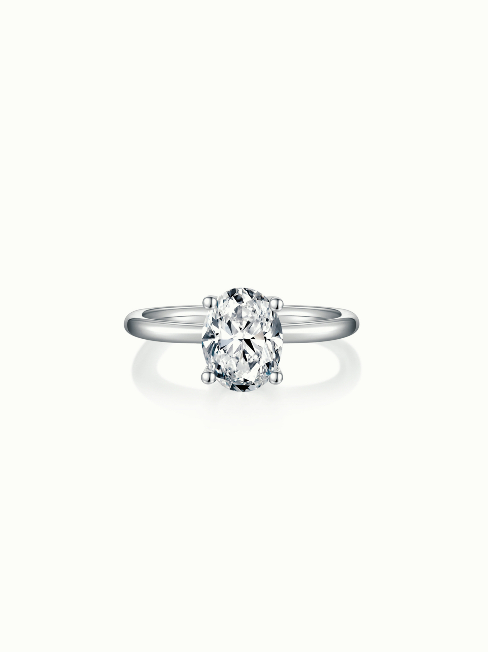 The oval-cut moissanite enhances the beauty of the hand through its elongated, graceful form. Its curves balance gentleness and strength. Crafted in White Gold Vermeil and set with world-class moissanite, its larger carat design reflects refined and noble brilliance.