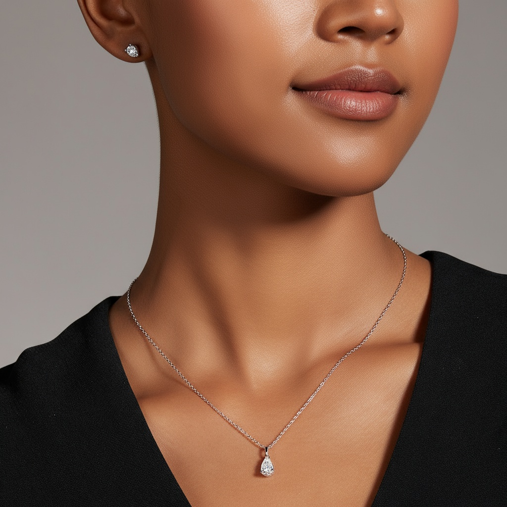 The pear shape moissanite resembles a drop of light, graceful and fluid. Each glimmer enhances the wearer’s natural composure. Set with world-class moissanite and handcrafted in White Gold Vermeil, it radiates effortless refinement.