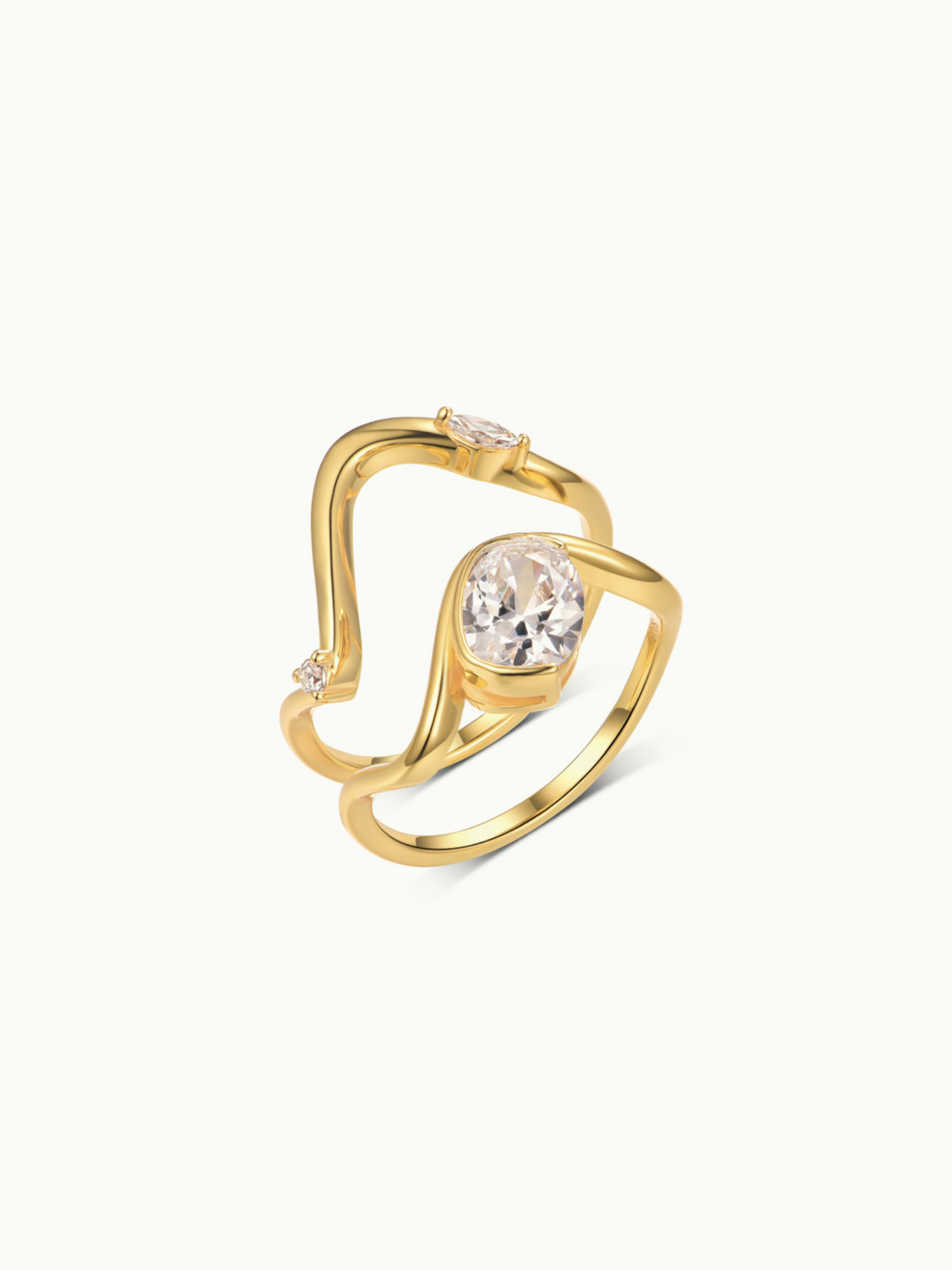 a cushion-cut moissanite rests upon sculpted gold vermeil lines, paired with a matching band that echoes its flowing contour. together, they compose a serene balance of form and light.