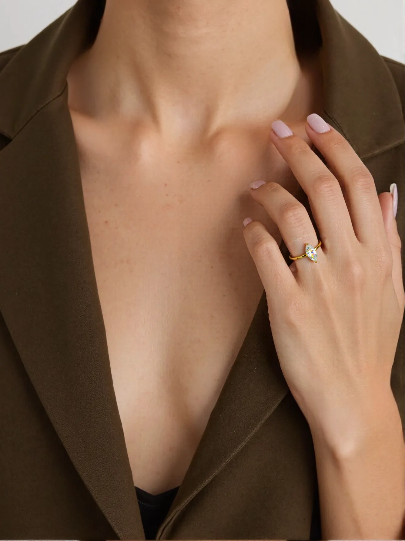 A marquise-cut moissanite floats atop a sleek gold vermeil band, its elongated silhouette adding a touch of refined brilliance. Simple, sculpted, and effortlessly elegant.