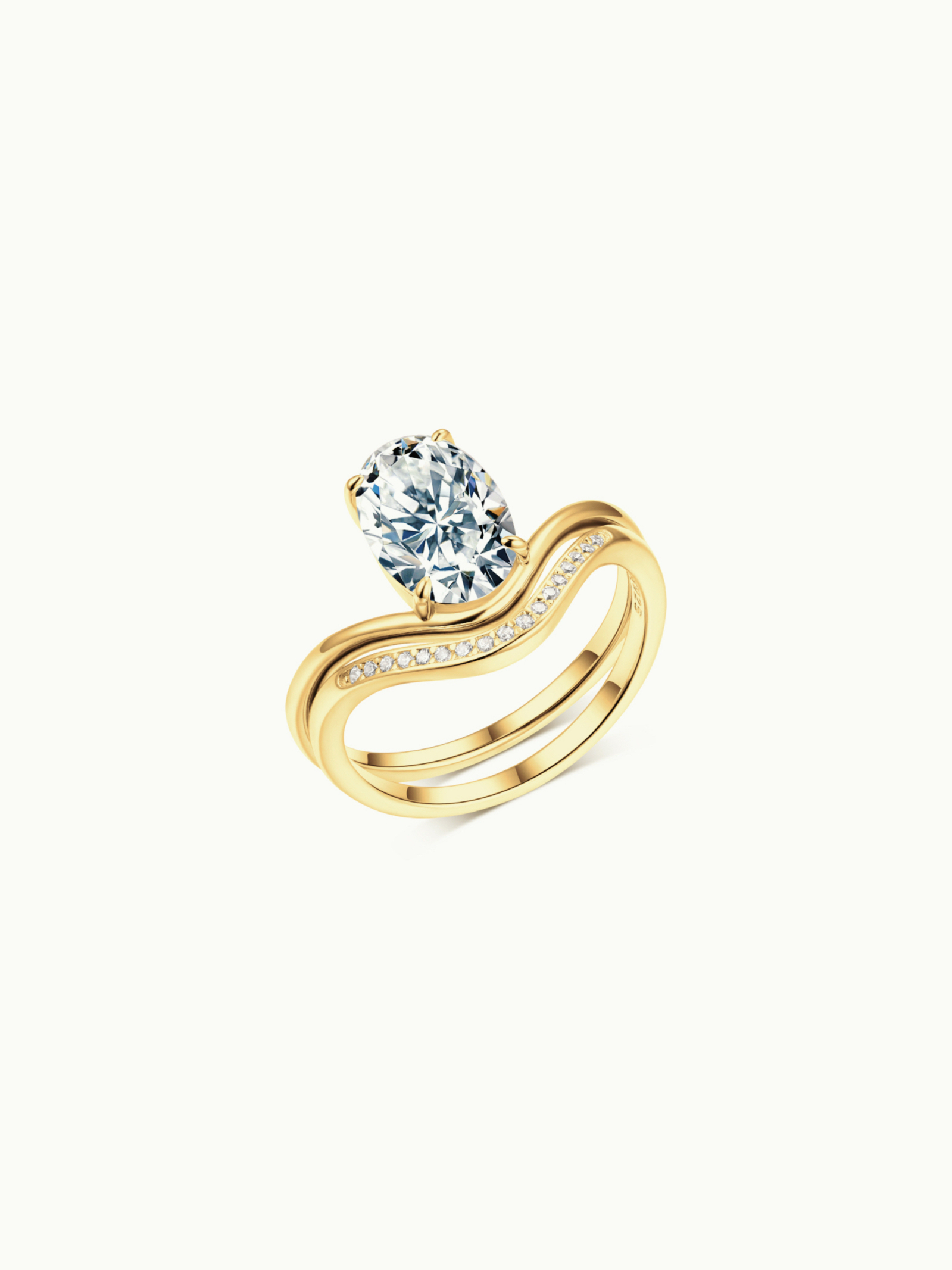 an oval-cut moissanite crowns soft gold vermeil curves, paired with a contoured band that mirrors its gentle rhythm. A luminous balance of shape and motion.
