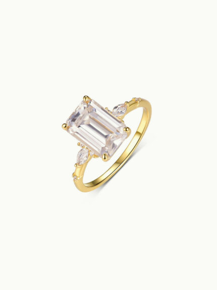 A radiant-cut moissanite rises from sleek gold vermeil lines, its crisp geometry softened by the ring’s gentle curve. A quiet statement of modern light and clarity.