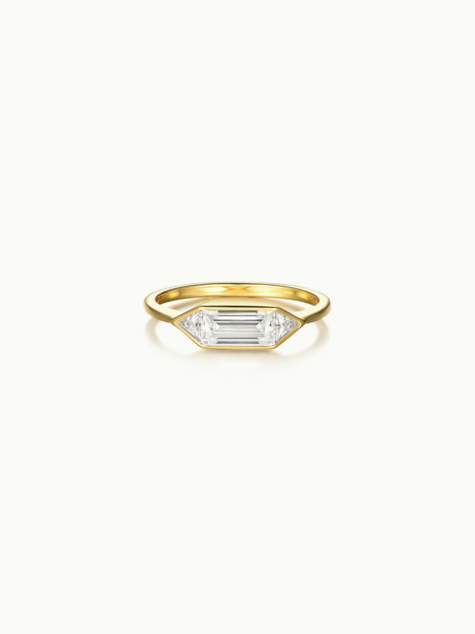 A sleek step-cut moissanite set in polished gold vermeil, crafted with clean lines and modern symmetry. Understated, architectural, and effortlessly luminous.